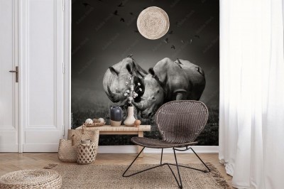 Fototapeta Dwa nosorożce z ptakami w czerni i bieli