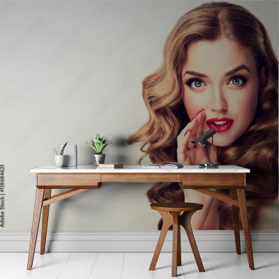Fototapeta Piękna dziewczyna z jasnym makijażem i kręconymi włosami mówi sekret