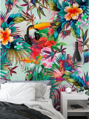 Fototapeta Tukan na tle kolorowych liści i kwiatów
