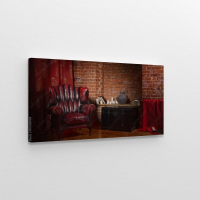 Obraz na płótnie Antyczne krzesło przy ścianie z cegieł
