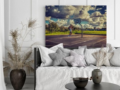 Obraz na płótnie Leworęczny koszykarz skaczący do obręczy