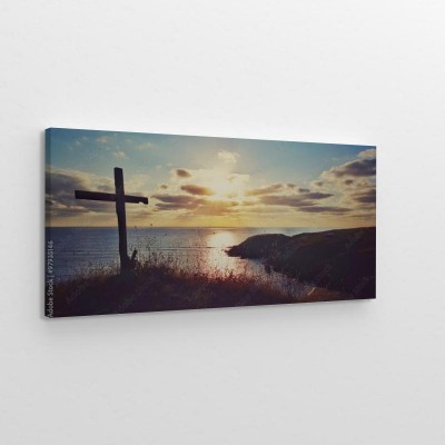 Obraz na płótnie Sceniczny wschód słońca nad linią brzegową z osadzonym krzyżem