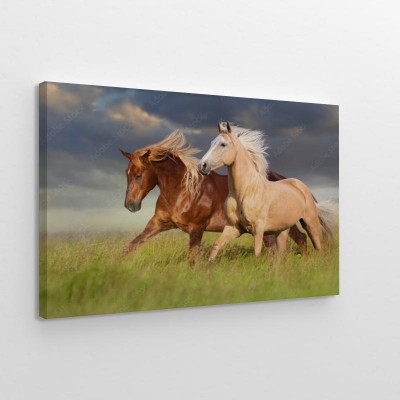 Obrazy do salonu Dwa konie kłosem po zielonej łące