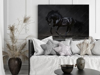 Obrazy do salonu Galopujący czarny koń na ciemnym tle