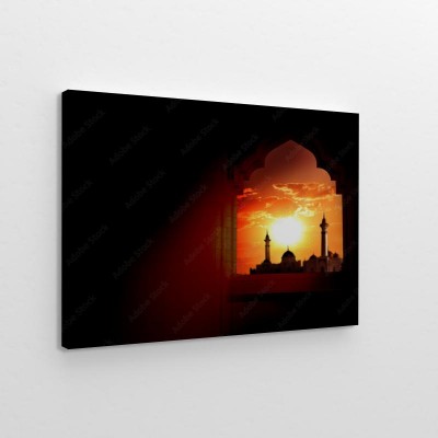Obrazy do salonu Rehal z otwartym Koranem na muzułmańskim dywanie modlitewnym w pomieszczeniu
