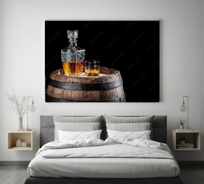 Obrazy do salonu Stara dębowa beczka i szklanka szkockiej