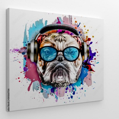 Obrazy do salonu z intensywnie kolorowym motywem psa w słuchawkach i okularach.