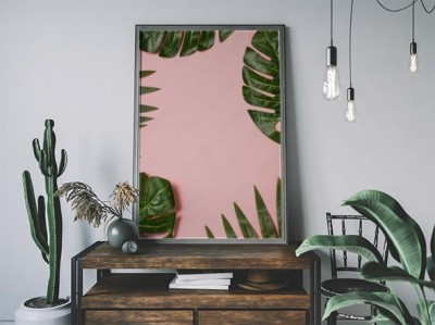 Plakat Ramka z tropikalnych liści na różowym tle